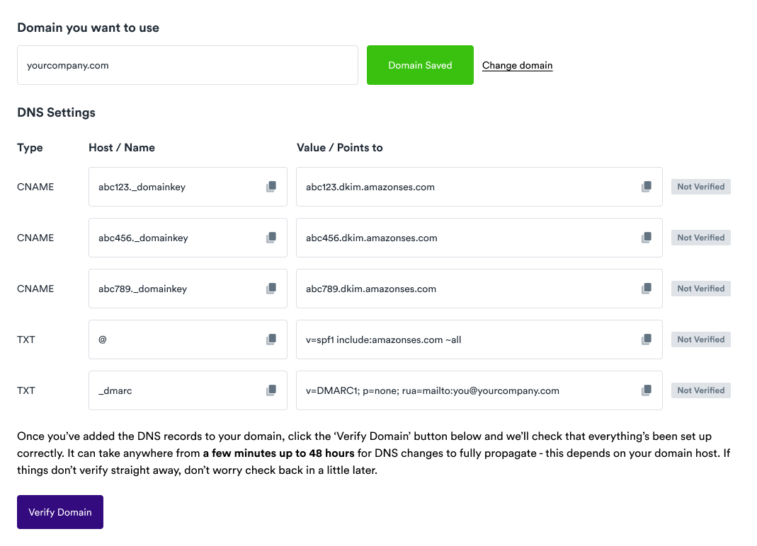 Note: your email needs to match the domain you previously verified (e.g. matt@yourcompany.com and not matt@someothercompany.com)