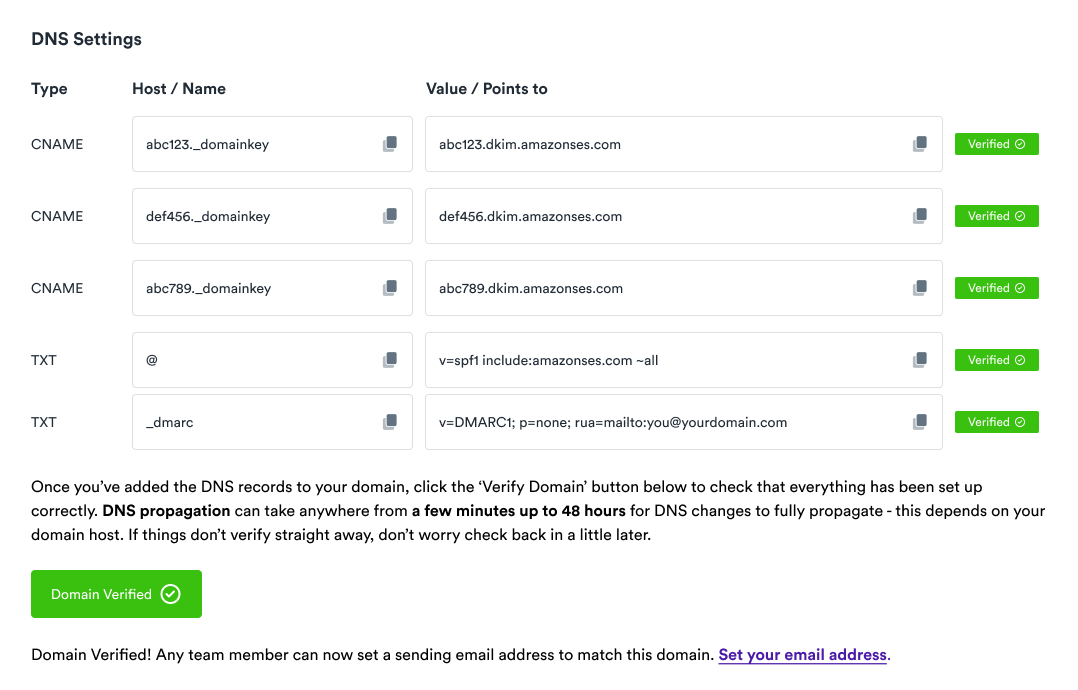Once all required records are verified, you’ll see a confirmation message: “Domain Verified! Any team member can now set a sending email address to match this domain.”