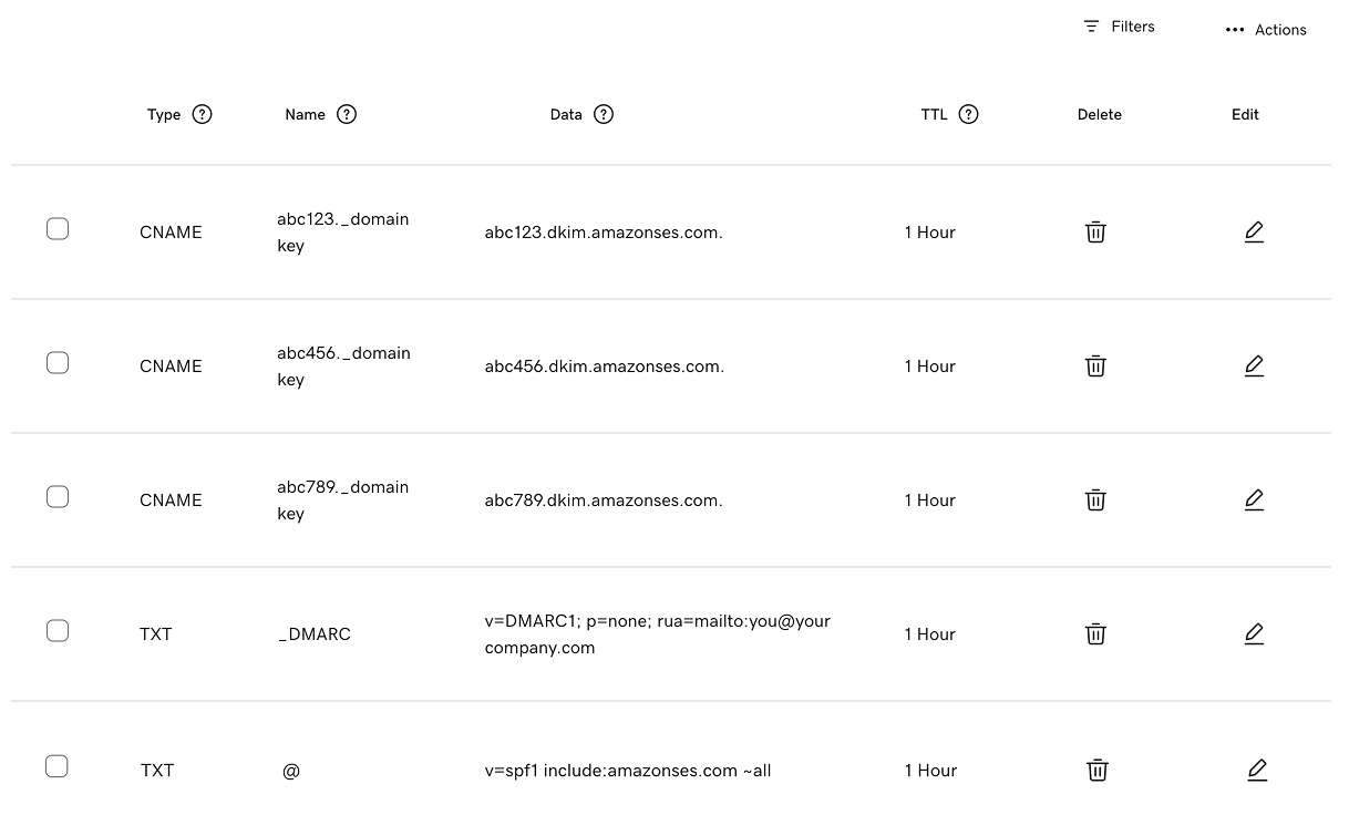 Important! You can only have 1 SPF record in your DNS per domain. If you already have an SPF record (which starts as v=spf1), simply add “include:amazonses.com” to it – don’t create a new record. For example v=spf1 include:microsoft include: amazonses.com include:abc.com – all