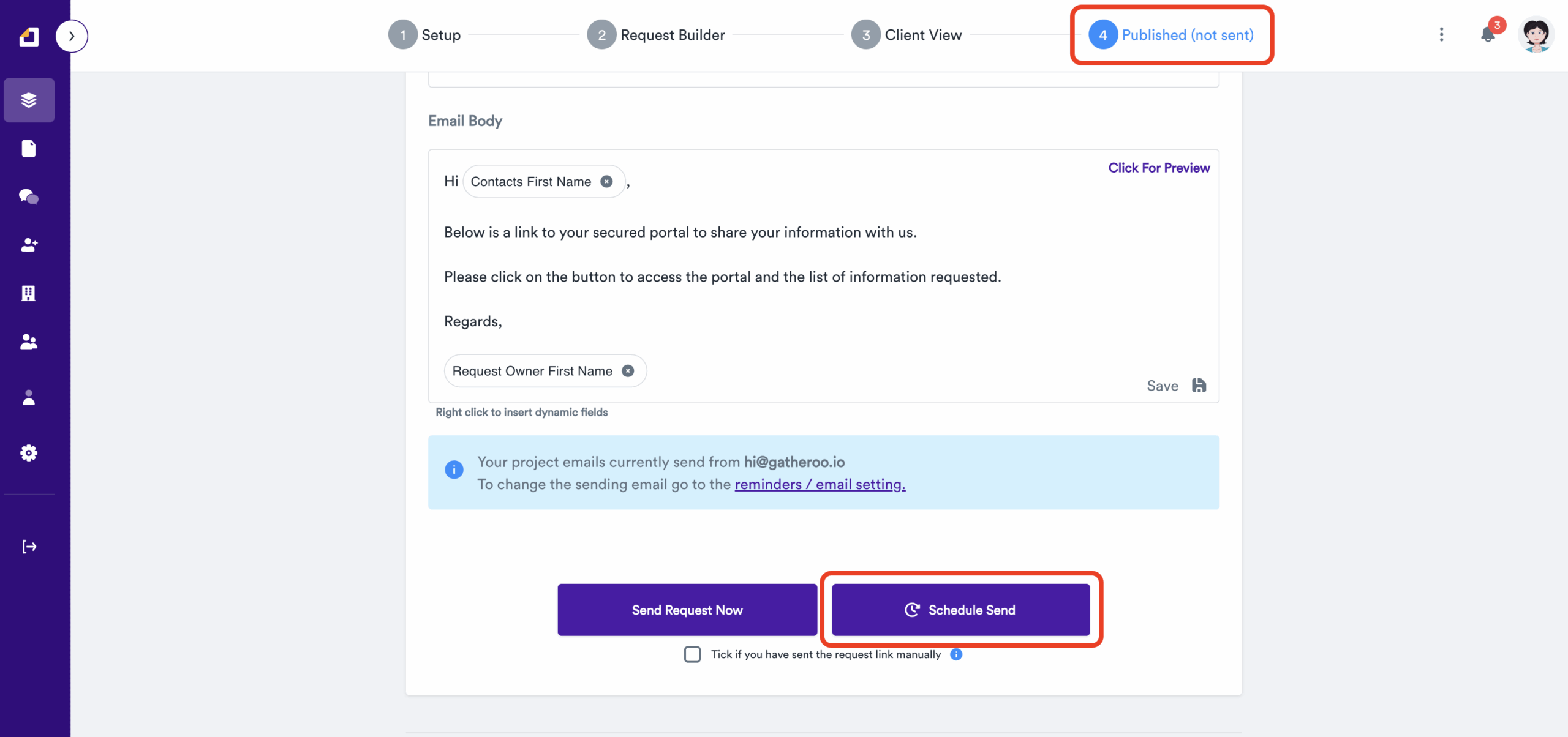 Gatheroo’s Schedule Send feature allows you to create and finalise requests now, and have them automatically sent at a future date and time.
